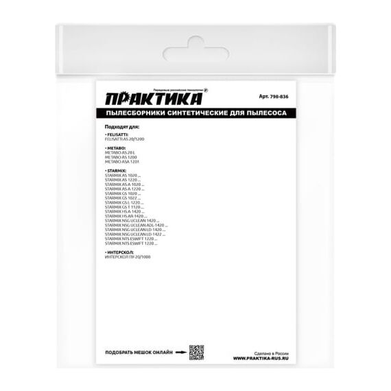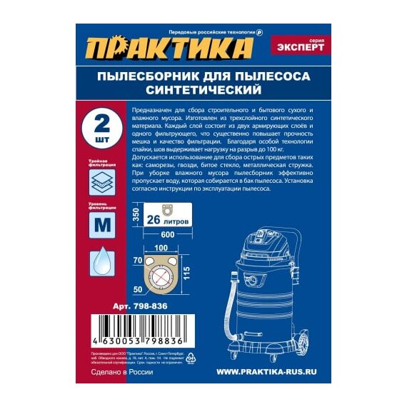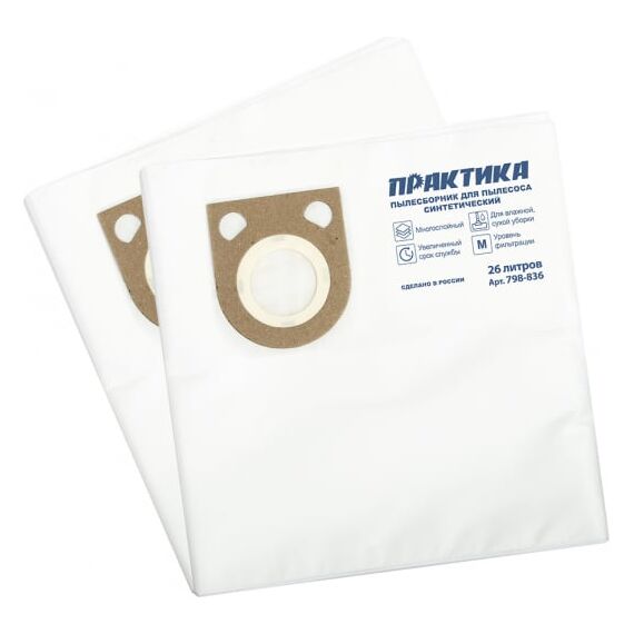 Мешки ПРАКТИКА 26 л, синтетич., 2 шт для пылесосов BTI, FELISATTI, METABO, STARMIX, ИНТЕРСКОЛ 798-836 предназначены для сбора строительного и бытового сухого и влажного мусора.