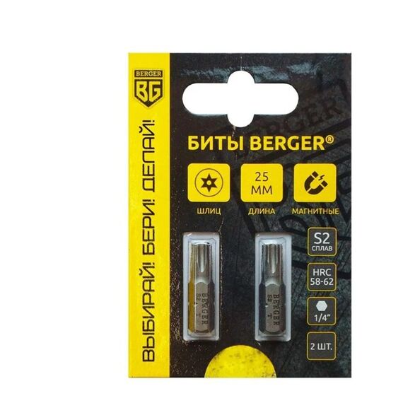 Биты магнитные BERGER BG2392, TORX c отверстием T25Hx25мм, 2 шт, S2/
