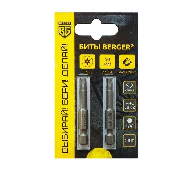 Биты магнитные BERGER BG2413, TORX с отверстием T15Hx50мм, 2 шт, S2/