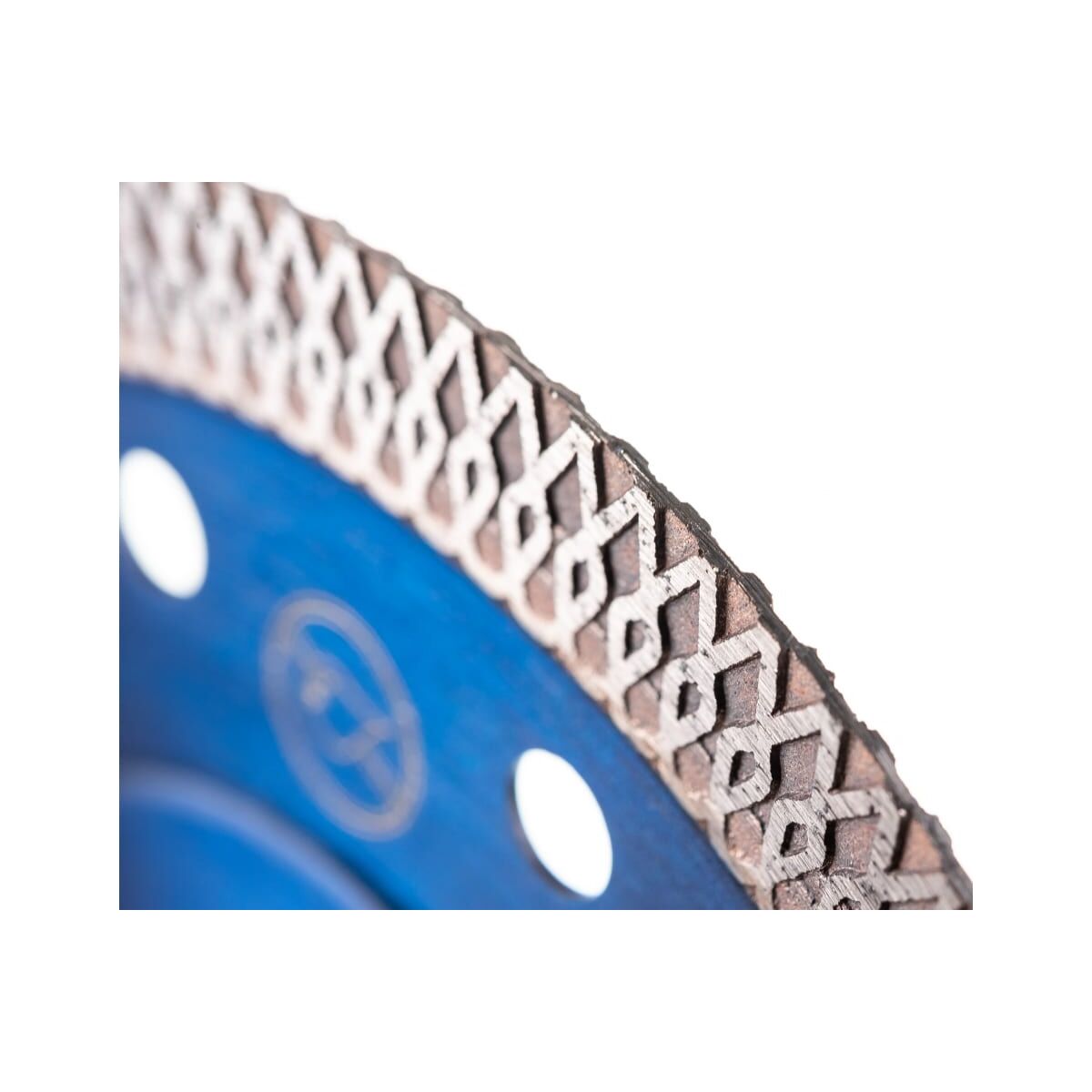 Особенности: Х-образная режущая кромка позволяет резать без применения воды. Фланец на корпусе диска, для дополнительной жесткости корпуса, и ультратонкая режущая кромка обеспечивают чистый рез без сколов. Высота алмазного слоя - 10 мм.