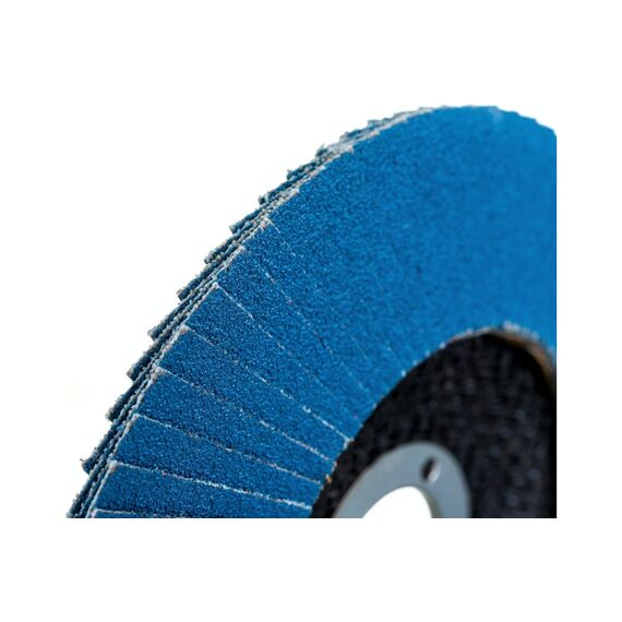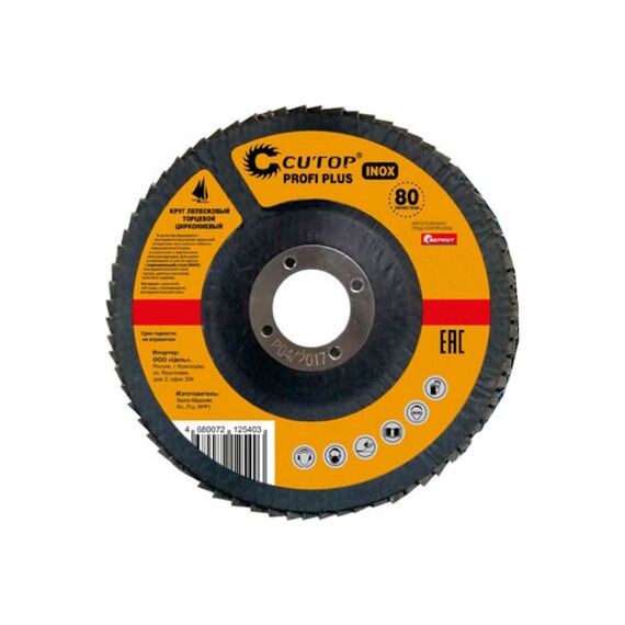 Круг наждачный лепестковый по металлу Plus (125 х 22.2 мм; Р120; циркониевый) CUTOP 72-125120 производится из гибкого абразивного материала высокого качества, состоящего из тканевой основы с нанесенным слоем циркониевого электрокорунда. Обладает повышенной прочностью и имеет коэффициент шлифования в несколько раз выше, чем круги на основе нормального электрокорунда. Структура циркониевого электрокорунда даёт эффект самозатачивания, что также увеличивает ресурс использования. Наполняемость диска составляет 80 лепестков, угол наклона 10 градусов. Диск применяется для обработки металла, нержавеющей стали, сварных швов, пластика, дерева.