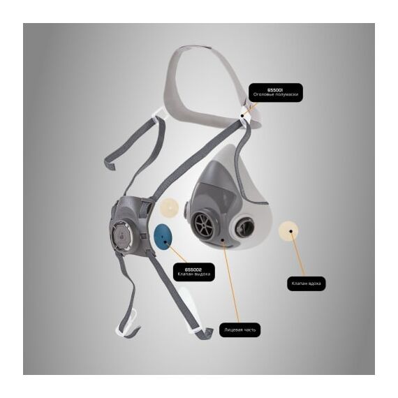 Предусмотрена система регулировки, позволяющая перемещать полумаску по стропам оголовья Низкое сопротивление дыханию