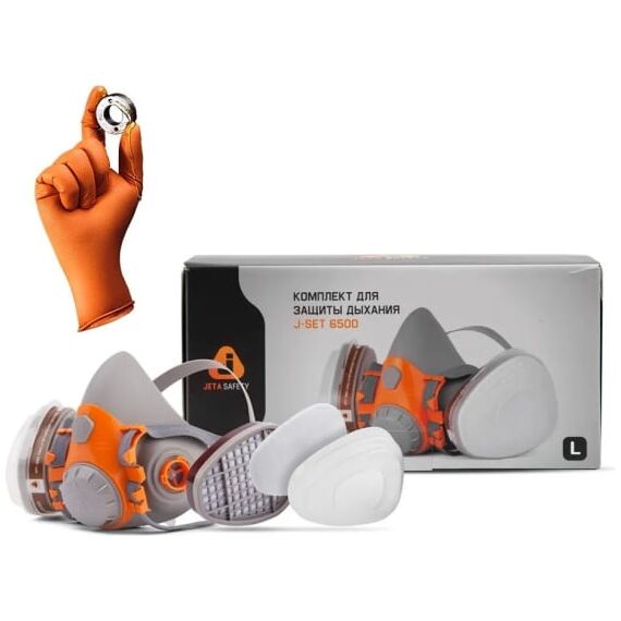 В комплект входят силиконовая полумаска 6500 М, 2 фильтра 6510 (А1), 4 предфильтра 6020(Р2), 2 держателями предфильтров 5101 и парой нитриловых перчаток JSN Natrix.