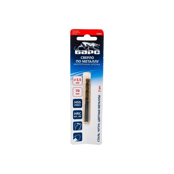 Сверло спиральное по металлу Барс 3,5 x 70мм, Р9М3, многогранная заточка, 2шт. (71854)