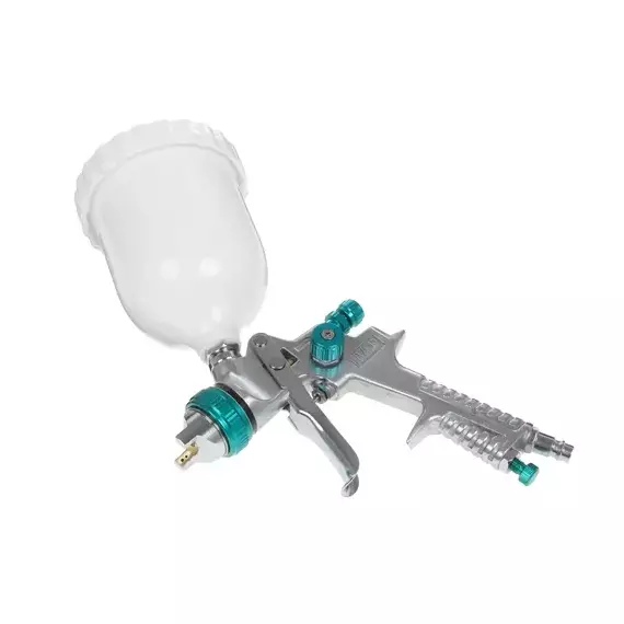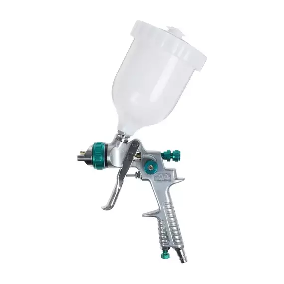 При создании краскораспылителя применялись качественные компоненты. За счет этого можно добиться продолжительного срока службы. Используется система распыления HVLP. Краска равномерно ложится на окрашиваемые поверхности, вы оцените отличный результат.