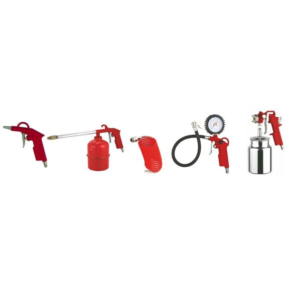 Комплектация пневмокраскопульт с нижним бачком объемом 0.75 л., пневмопистолет продувочный, пневмопистолет мовильный, шланг спиральный 5 м., пнемопистолет для накачки шин