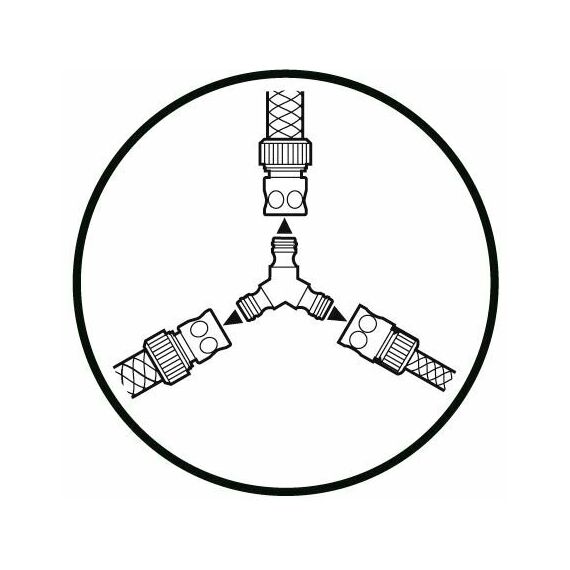Тройник предназначен для соединения одновременно трех шлангов, позволяя таким образом значительно увеличить площадь поливаемой почвы, разделяя линию на две.