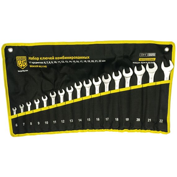 Набор ключей BERGER BG114 комбинированных 17 предметов 5 в матерчатом чехле, 6-22 мм