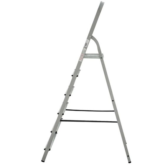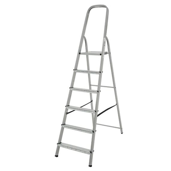 Стремянка стальная Стандартная «Новая Высота» NV 1150 1х6 ступеней обладает высокой прочностью и надёжностью при лёгком весе. Предназначена для бытового использования. Проста в установке и удобна в работе. Компактна при хранении и транспортировке. Стойки каркасов и перекладины изготовлены из прочного стального профиля с порошковой покраской. Ступени глубиной 70 мм из стали с покрытием гальваническим цинком. На поверхность ступеней нанесено рифление для безопасного подъёма и спуска. Ступени крепятся к стойкам четырьмя стальными заклёпками. Для размещения инструмента и рабочего инвентаря предусмотрена рифлёная площадка из оцинкованной стали. Дуга безопасности 600 мм. Страховочные ремни из высокопрочного нейлона. Для устойчивого положения на поверхности стойки оснащены опорными наконечниками из ударопрочного пластика. Практичность и внимание к каждой детали гарантируют безопасность работы на любой высоте. Максимальная нагрузка 150 кг.