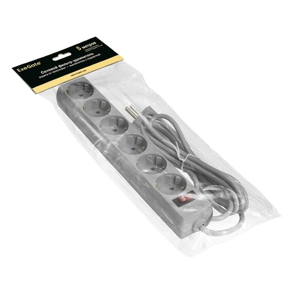 Сетевой фильтр ExeGate SP-6-5G EX119394RUS серый 6 евророзетки с заземлением, 5м, защита от перегрузки, выключатель с подсветкой