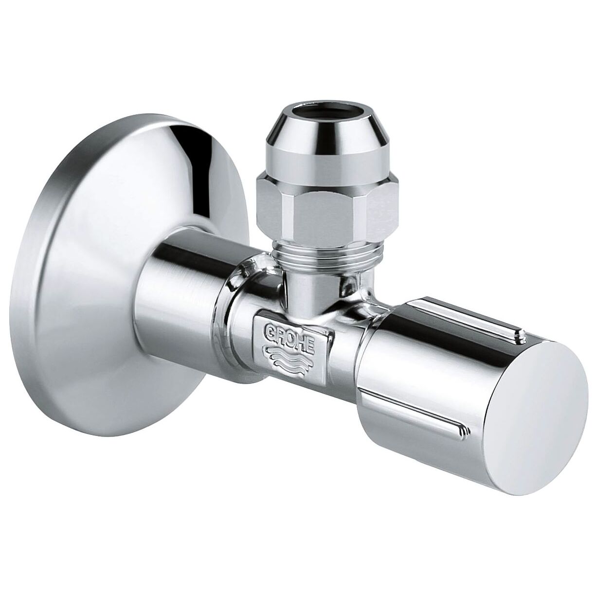 Универсальный угловой вентиль для подключения смесителей на медных трубках Ø10 мм или на гибкой подводке с гайками 3/8". Резьба 1/2" с насечками для эффективного уплотнения, декоративная резьбовая розетка, эргономичная металлическая рукоятка, герметичный закрывающий шпиндель с резиновой манжетой и двумя кольцами уплотнения, хромированная поверхность GROHE StarLight
